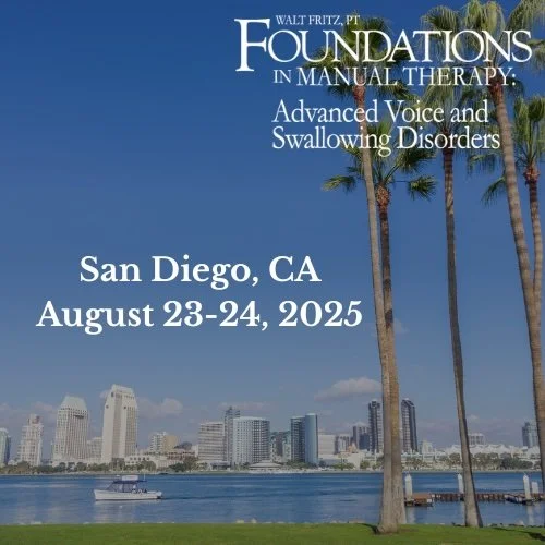 Foundations in Manual Therapy: Voice and Swallowing Disorders Seminar (in-person or online). You qualify if you’ve taken the Introductory class in person or online. Special discounts are available for those who wish to bundle the Online Introductory class with the in-person Advanced class. Please contact me using the link in the menu for more details.