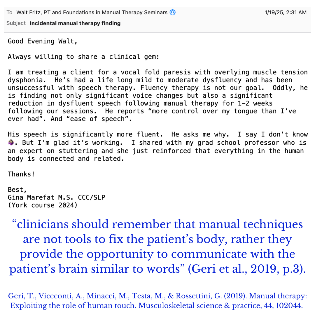 "Clinicians should remember that manual techniques are not tools to fix the patient's body, rather they provide the opportunity to communicate with the patient's brain similar to words.”