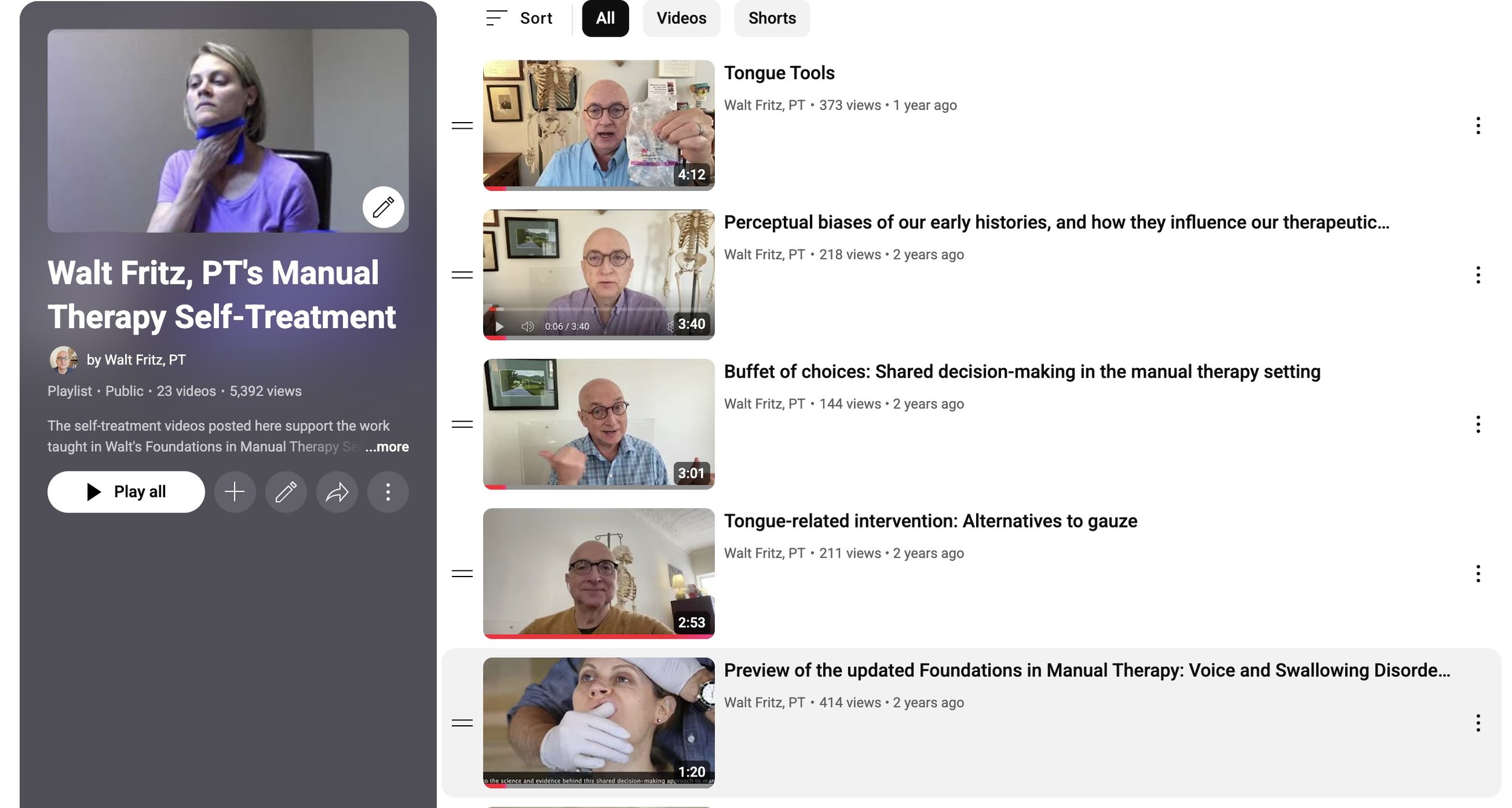 Want videos to support the work taught in the Foundations in Manual Therapy: Voice and Swallowing Disorders class? You may also wish to check out the many home stretching videos I’ve uploaded to YouTube.