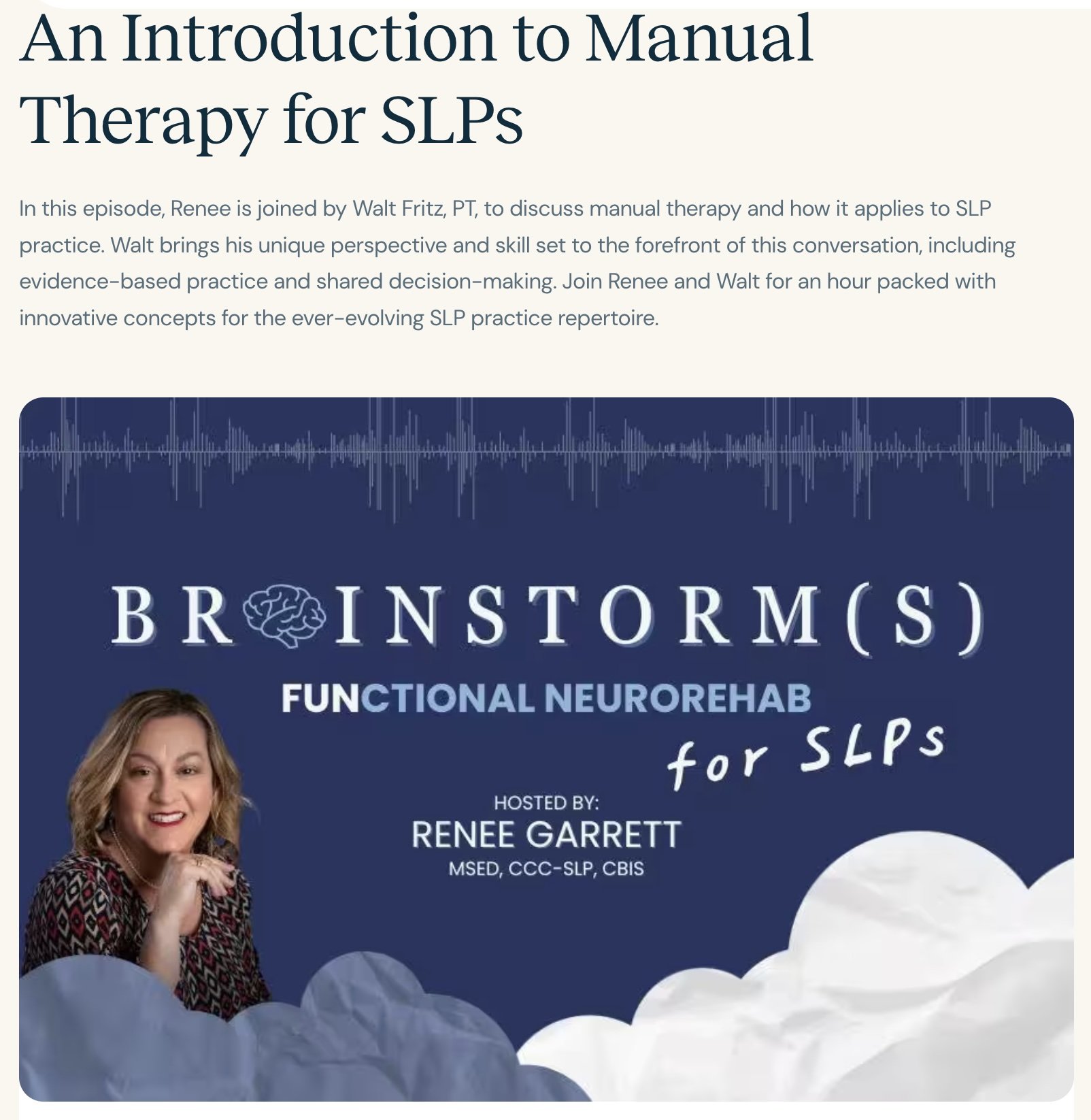 In this Brainstorm(s) episode, Renee Garrett is joined by Walt Fritz, PT, to discuss manual therapy and its application in SLP practice. Walt brings his unique perspective and skill set to the forefront of this conversation, including evidence-based practice and shared decision-making. Join Renee and Walt for an hour packed with innovative concepts for the ever-evolving SLP practice repertoire.